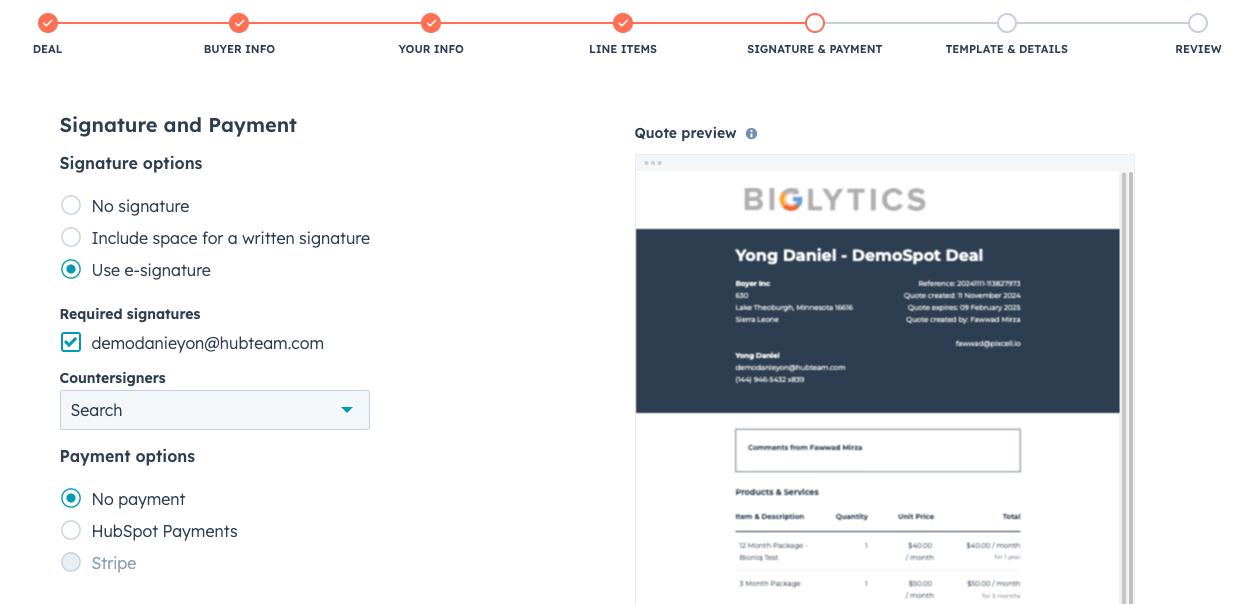 I love how this feature streamlines the entire process—from sending the quote to collecting payment. HubSpot lets you integrate payment systems like Stripe so your customers can pay directly from the quote, saving you time and ensuring a smoother transaction process.